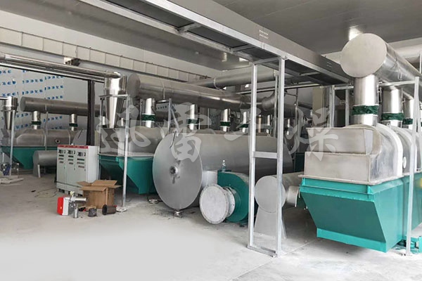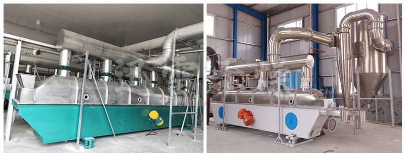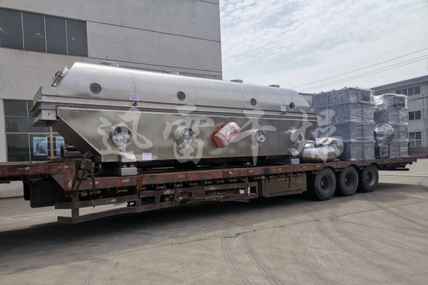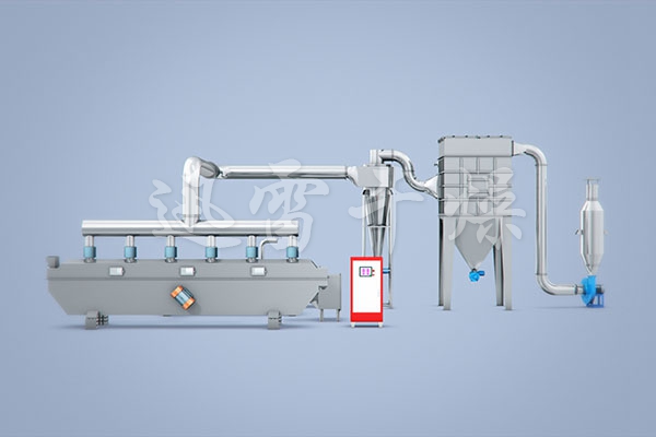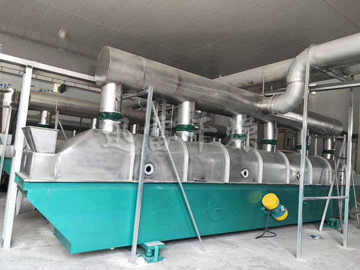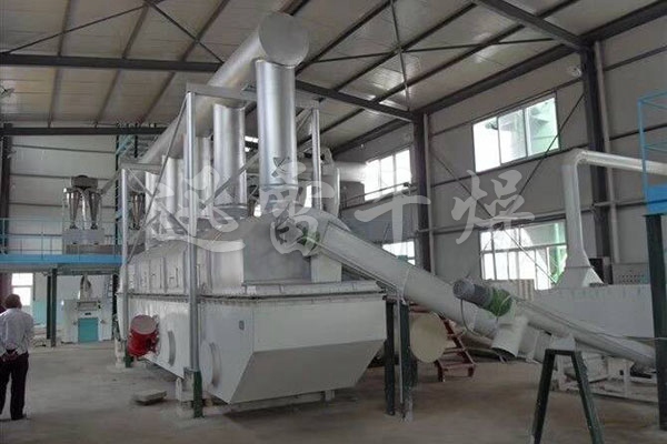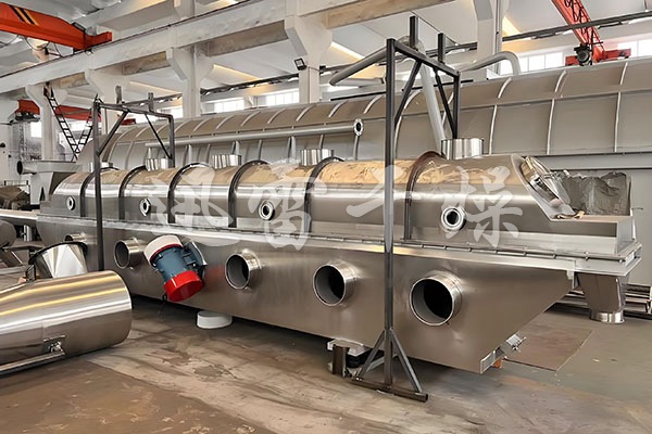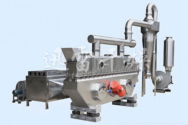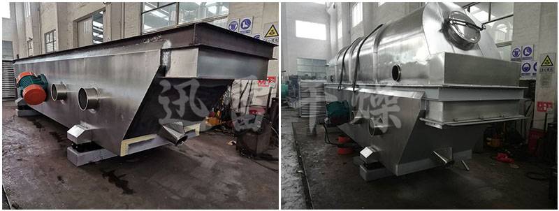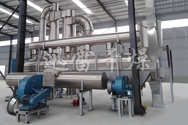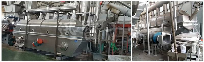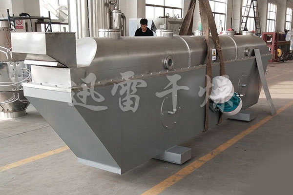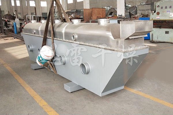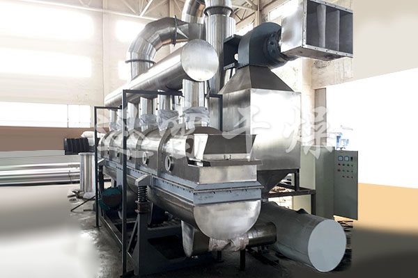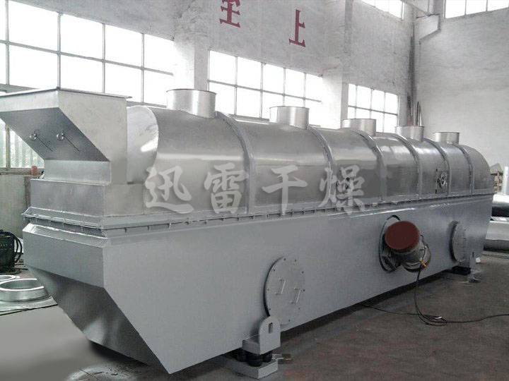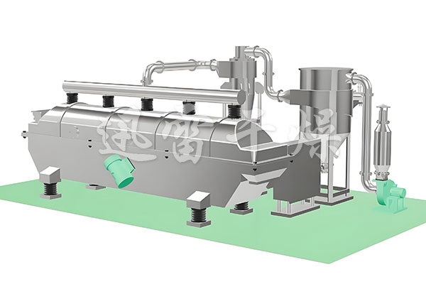 物料自进料进口进入机内,在振动力作用下,物料沿水平面流化床抛掷,向前连续运动,热风向上穿过流化床同湿物料换热后,湿空气经旋风分离器除尘后由排风1:3排出.干燥物料由排料进口排出。