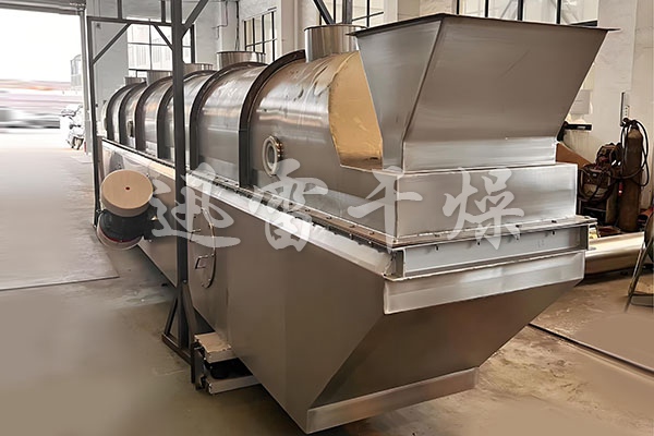 物料自进料进口进入机内,在振动力作用下,物料沿水平面流化床抛掷,向前连续运动,热风向上穿过流化床同湿物料换热后,湿空气经旋风分离器除尘后由排风1:3排出.干燥物料由排料进口排出。